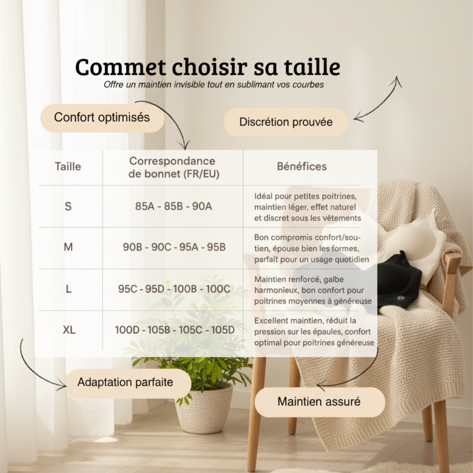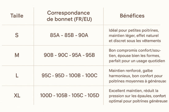 Notre soutien-gorge invisible est conçu pour s’adapter à toutes les morphologies. Grâce à son design ajustable, il s’adapte parfaitement à votre taille. Si vous êtes entre deux tailles, nous vous conseillons de choisir la taille supérieure pour plus de confort et de maintien. Consultez notre guide des tailles pour trouver la coupe qui vous correspond.